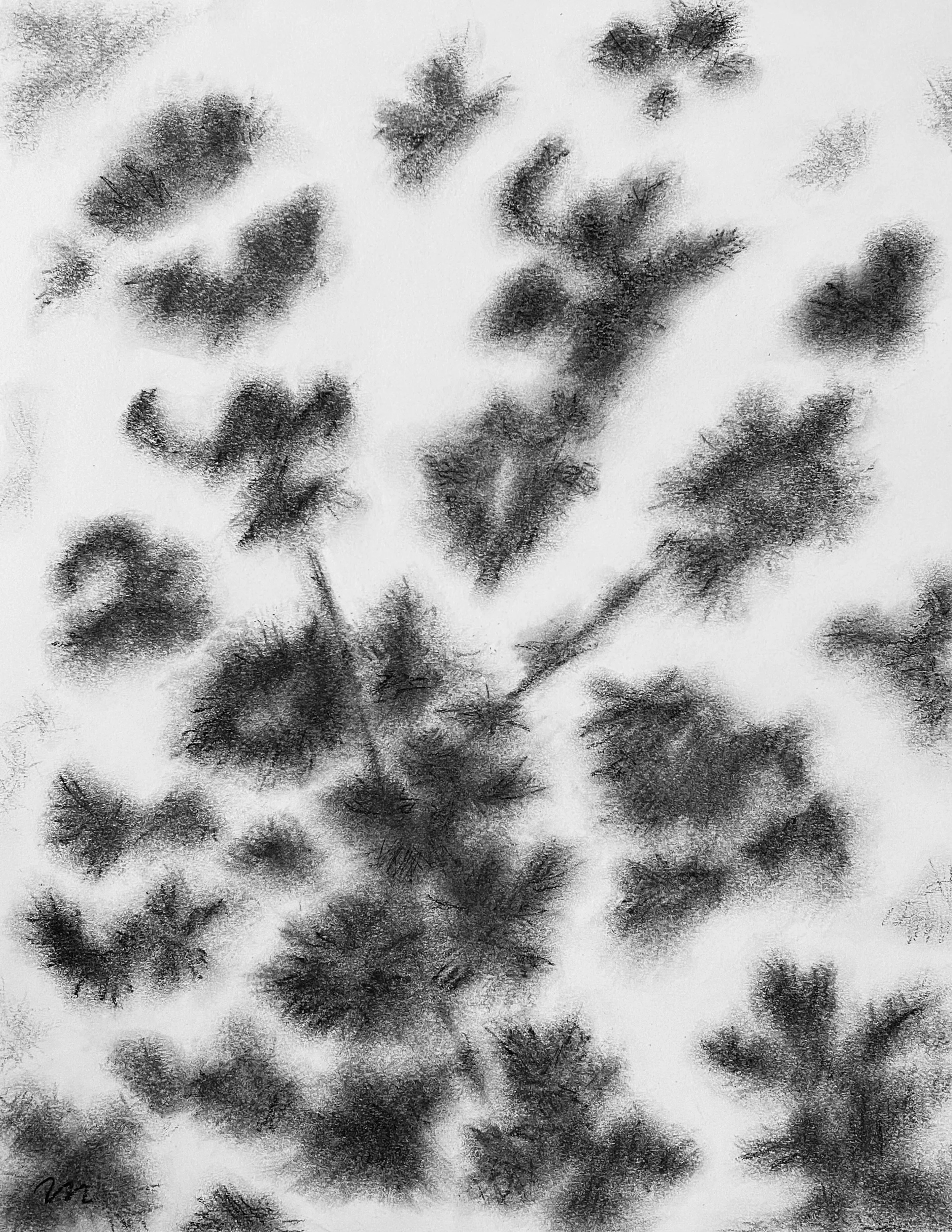 I like the immediacy of working with charcoal on paper whether combining minimal marks to suggest an image or creating layers that transition gradually from one shape to another. Charcoal is malleable in a way that paint is not because of the ability of paper to absorb charcoal and withstand surface treatments, whether burnishing a heavy layer for a saturated value or erasing and smudging to remove layers. The effects are endless but especially suited to the transient impressions I’m trying to convey.
